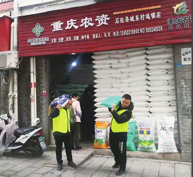 在重慶農(nóng)資連鎖石柱城東村連鎖店,化肥、農(nóng)藥、種子等農(nóng)資備貨充裕、擺放整齊,工作人員正有序搬運,準(zhǔn)備發(fā)往各個網(wǎng)點。